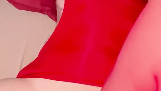 Istri sange dengan gaun merah dan suaminya yang alim lagi asik muasin memeknya pakai dildo ukuran XL